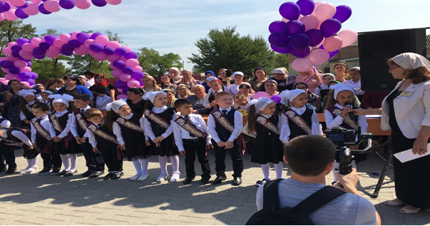 С самого утра на школьном дворе звучала музыка, на праздник шли нарядные ученики, а первоклассников встречали первые учителя. И вот фанфары известили о начале праздничной линейки. В этот день принимали поздравления не только первоклассники и их родители, но и все ребята, а также педагогический коллектив школы. Торжественная линейка открылась гимном РФ и ЧР, после которого директор школы Ящуркаев Хамзат Супенович поздравил всех с праздником и пожелал успехов в овладении знаниями.