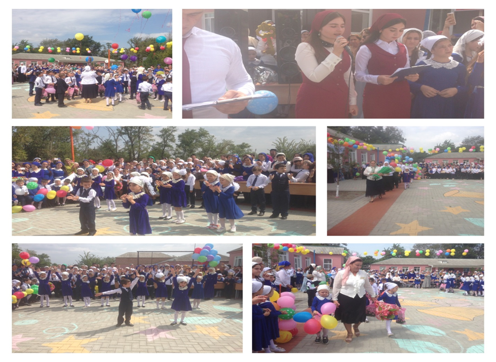 В этот день в нашей школе была проведена торжественная линейка, в которой приняли участие учащиеся 1-11 классов. Торжественная линейка началась с гимнов России и ЧР. Открыла линейку завуч ВР Джанаралиева Х.Н. Со словами приветствия и поздравления выступили директор школы Ящуркаев Х.С., глава администрации сельского поселения Гинаев А.Н. Ярким моментом праздника было выступление первоклассников. Затем они услышали в свой адрес теплые напутственные слова, а потом получили памятные подарки. Во всех классах проведены классные часы на темы: «Урок Мира», «День Знаний», «Семья и семейные ценности», «Уроки Памяти», посвящённые Первому президенту Чеченской Республики Ахмату – Хаджи Кадырову.